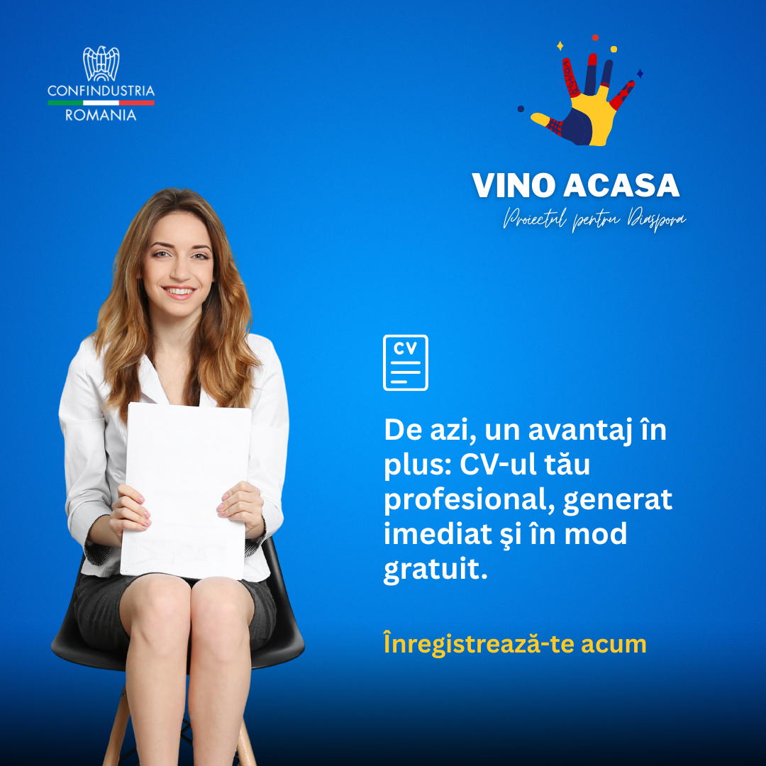 Vino Acasa este o inițiativă a Confindustria România care, împreună cu Mutua UNIREA, AMR – Asociația Municipiilor din România, Universitatea Babeș-Bolyai din Cluj și Intesa Sanpaolo Bank, oferă cinci avantaje concrete pentru întoarcerea în România: